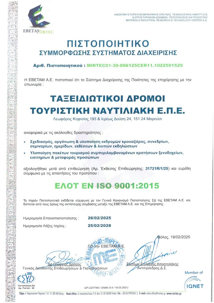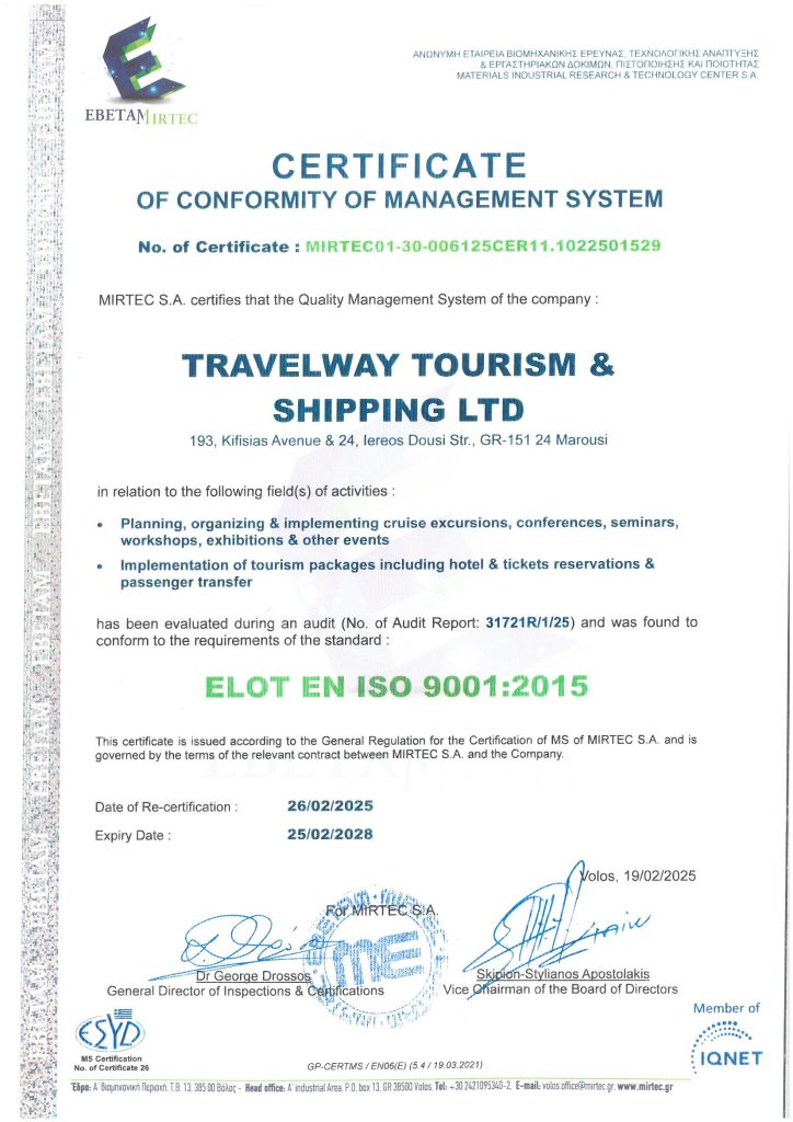 Travelway Tourism & Shipping Ltd. – Commercial Registry Number: 068451503000 – 193 Kifisias Av. & 24 Iereos Dousi st., 151 24 Marousi, Athens, Attica, Greece - Τel.: (+30) 210 6124016 - Fax.: (+30) 210 8055865 - Email: info@travelway.gr